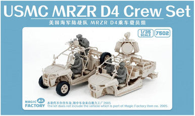 Magic Factory's 1/35 USMC MRZR D4 crew set (No.7502) is suitable for their 1/35 US MRZR D4 ultra-light all-terrain vehicle (No.2005) . This set contains 4 unpainted Resin figures.
