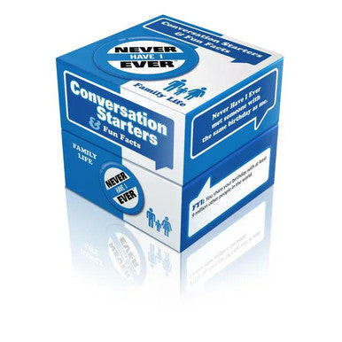 Never have I ever party conversation starters, family edition, ages 8 and above.